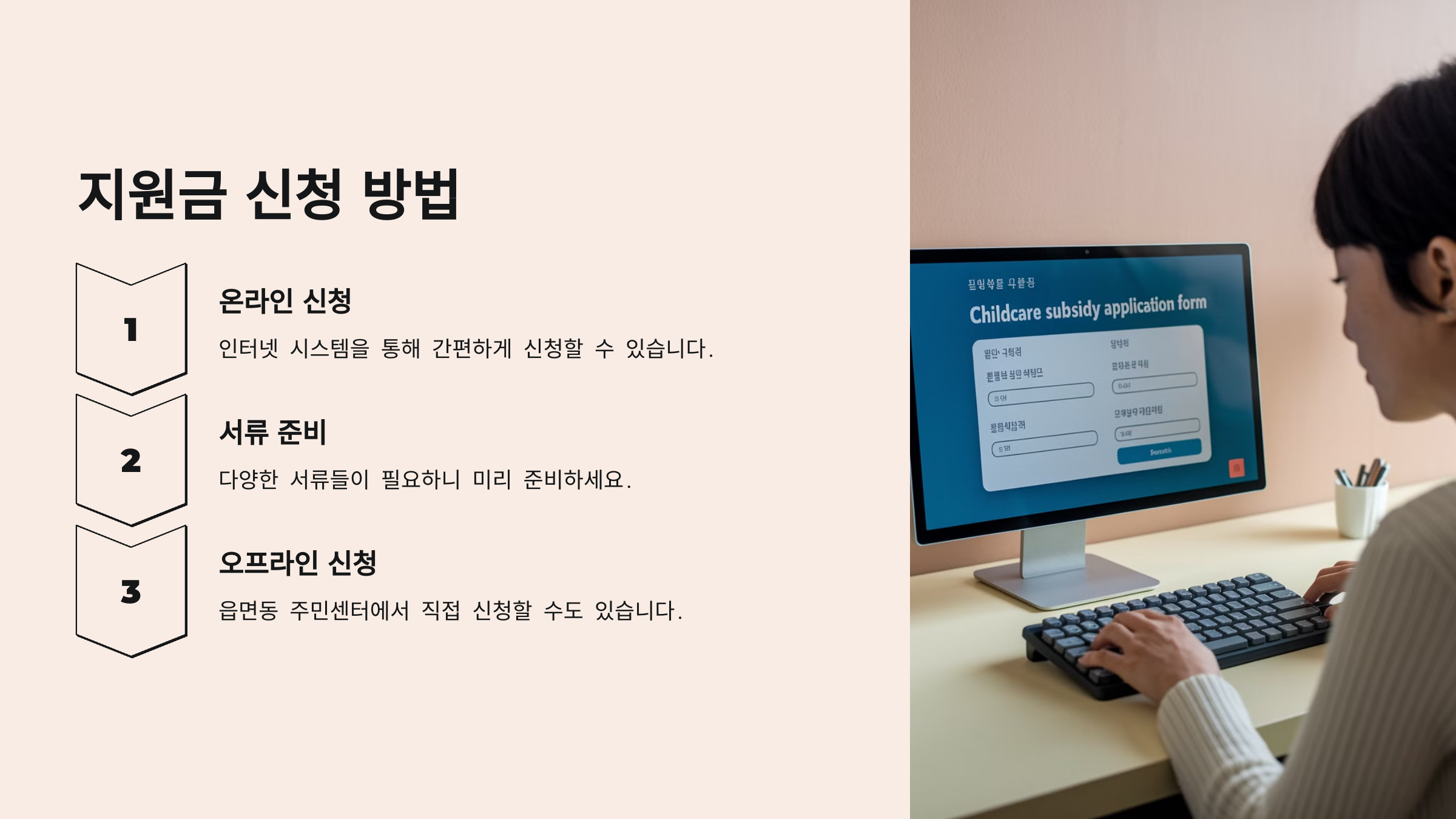 어린이집과 유치원 지원금을 신청하는 방법은 여러 가지입니다. 온라인 시스템을 통해 간편하게 신청할 수 있으며, 읍면동 주민센터에서 직접 신청할 수도 있습니다. 다양한 서류들이 필요할 수 있으니 미리 준비해 두는 것이 좋습니다. 온라인이 익숙하지 않다면, 주변의 도움을 받거나, 필요한 자료를 미리 상담해보는 것도 도움이 됩니다. 이렇게 하면, 맞벌이 가정 필수! 어린이집·유치원 지원금 200% 활용법의 첫 발을 내딛게 됩니다.