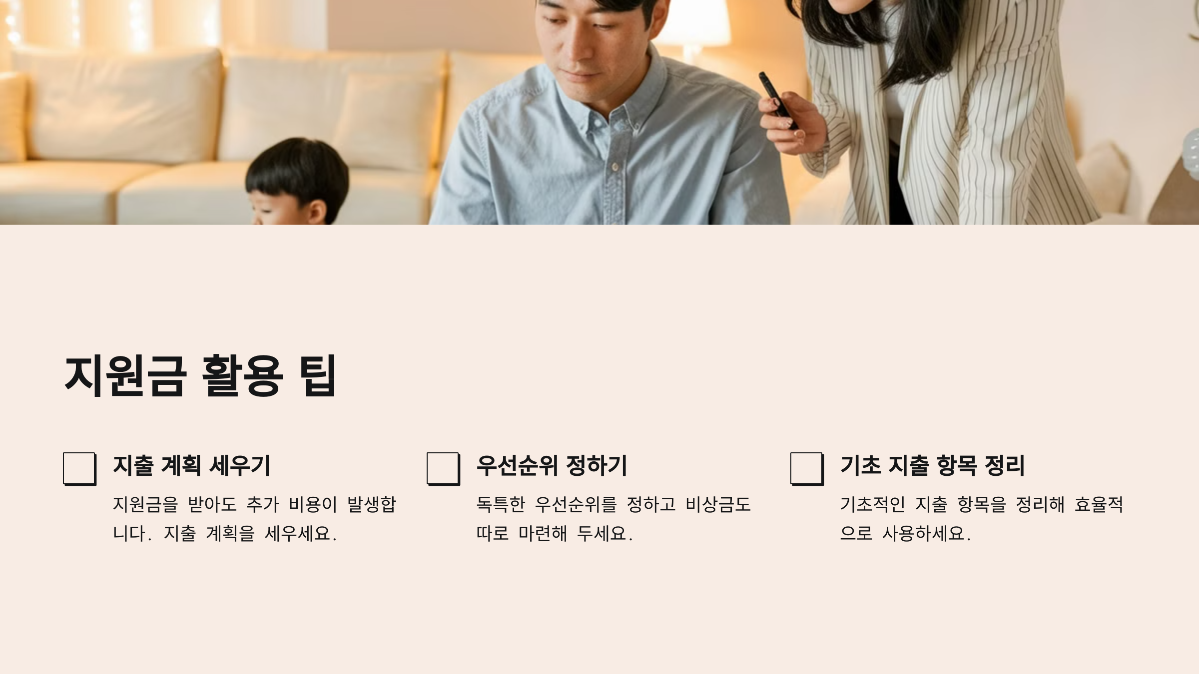 우선, 지출 계획을 세우고, 필요 경비를 우선 정해두세요. 추가적인 지원 혜택도 찾는 것이 중요합니다.