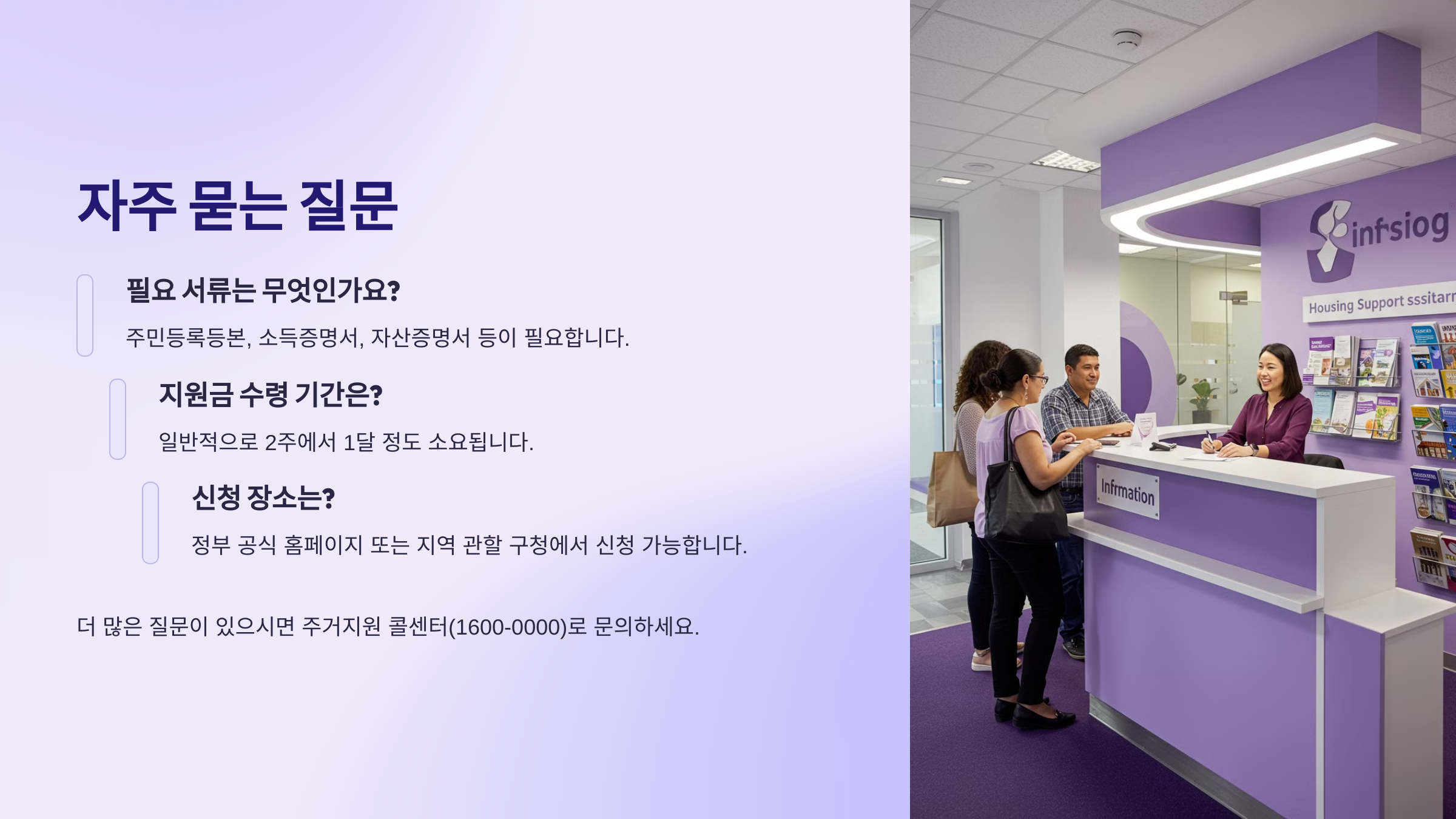 신청서 작성 시 필요한 정보는 본인의 인적 사항, 소득 증빙 자료, 주거 현황 등입니다. 이후 해당 자료를 제출하고, 진행 과정을 온라인 또는 오프라인으로 확인하세요. 처리 기간은 개인의 상황에 따라 달라질 수 있습니다. 항상 가능한 빠른 시일 내에 지원을 받을 수 있도록 준비해야 합니다.