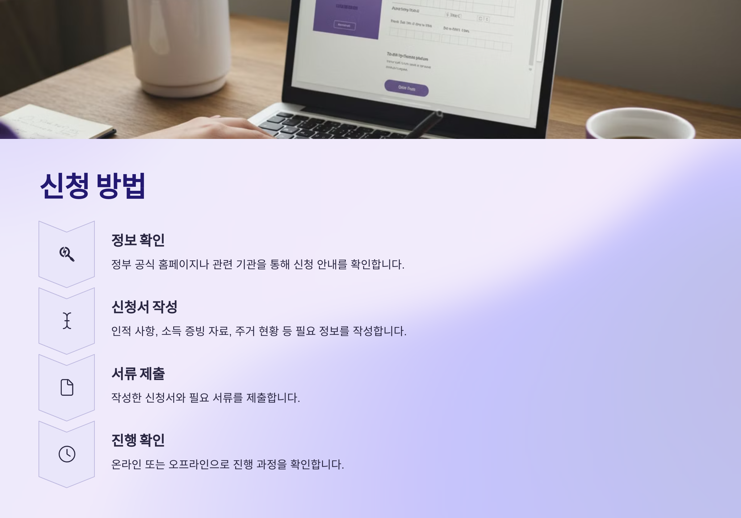 정부 공식 홈페이지 또는 지역 관할 구청에서 온라인, 오프라인으로 신청할 수 있습니다.