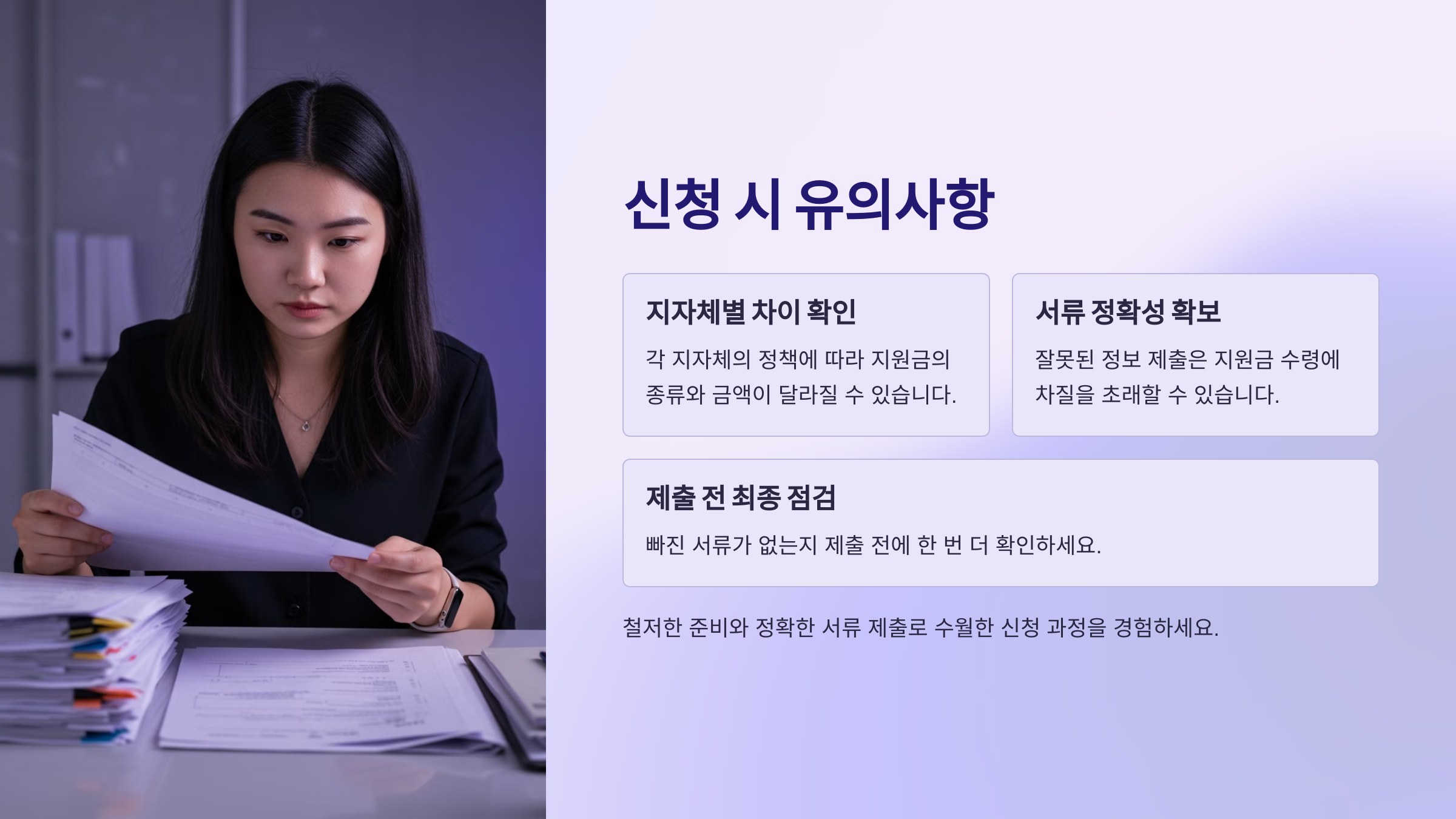 신청 과정에서 놓쳐서는 안 될 부분은 바로 유의사항입니다. 각 지자체의 정책에 따라 지원금의 종류와 금액이 다를 수 있으니, 해당 사항을 반드시 확인합시다. 또한, 제출된 서류의 정확성 또한 매우 중요합니다. 잘못된 정보는 지원금 수령에 큰 차질을 초래할 수 있습니다.